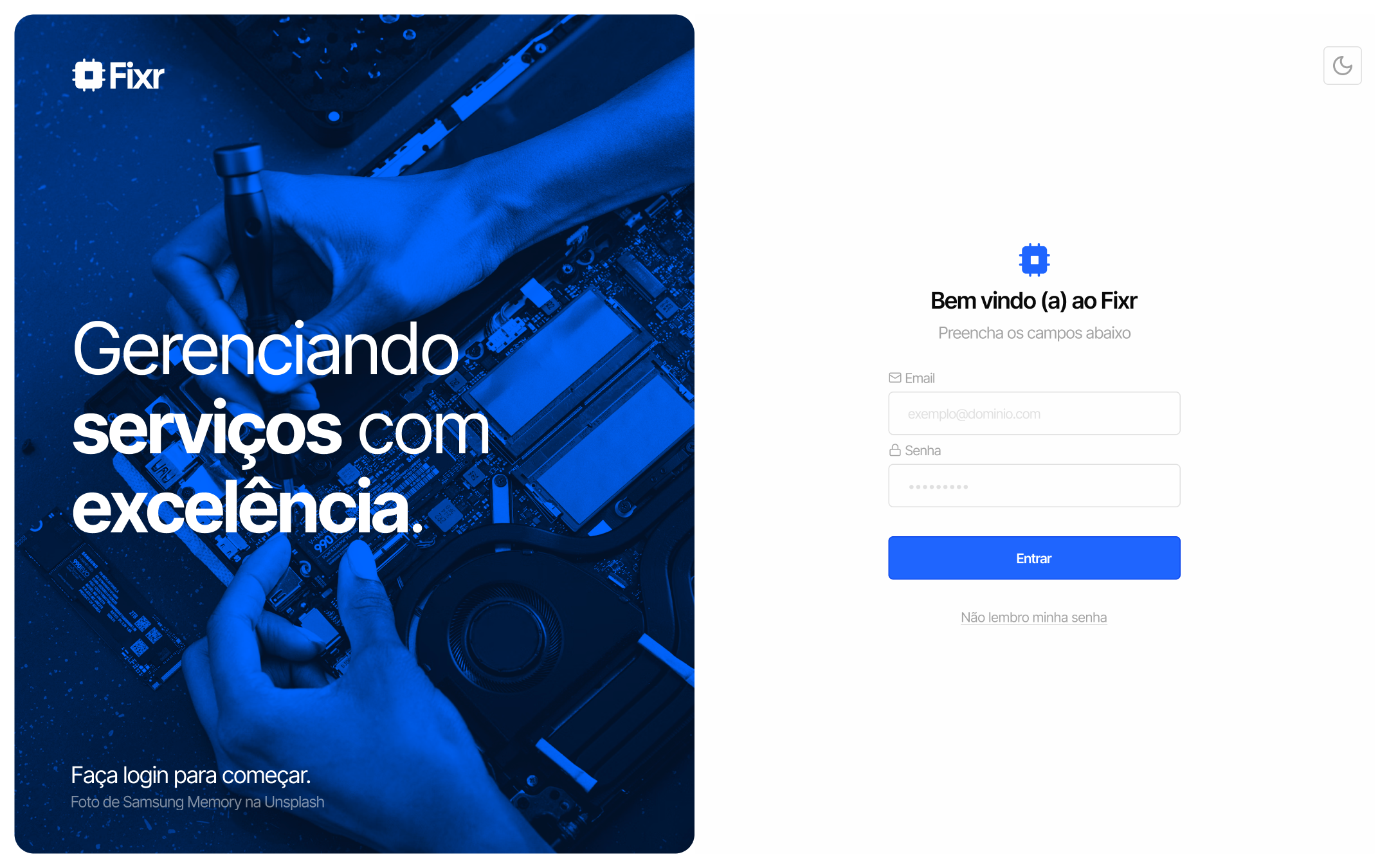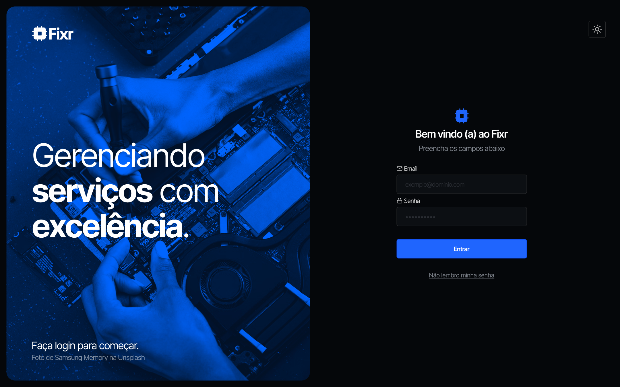 A tela de login do Fixr segue os princípios do sistema de design, com foco na simplicidade e clareza. Esta tela utiliza o azul da marca para destacar os elementos principais, como o botão de “Entrar”, enquanto o fundo permanece em um tom neutro, variando entre o tema claro e escuro, que facilita o foco no formulário de autenticação.