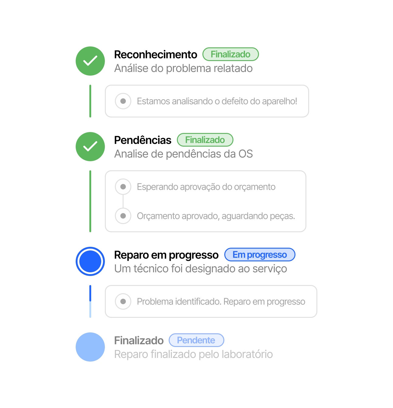 Componente de status da "OS" com as diferentes etapas e comentários dos técnicos